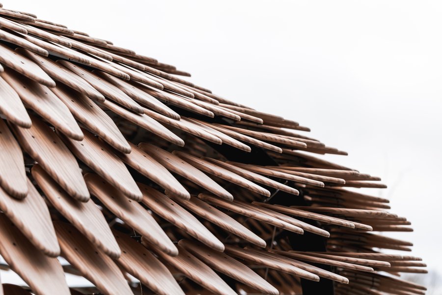 2025 project Eyrie builds on these ideas in a sculptural oasis in Reading, UK, where residents and visitors can find a sanctuary for calm and quiet contemplation. “Eyrie combines the beauty of natural timber with a sculptural composition that bridges engineering and the natural world,” Giles says. “It’s the relationship between nature and our built environments that is a particular fascination of mine, and the project sits to bridge the two in a functional and also evocative way.” Eyrie’s pinecone-like exterior, made of thousands of custom-designed Abodo timber shingles, offers a living, tactile experience that “invites visitors to engage with the structure as they would with the natural world - through exploration, curiosity and touch. Abodo’s material enabled us to perfectly deliver a beautiful ambassador for nature, but in a sustainable way that has true longevity.”